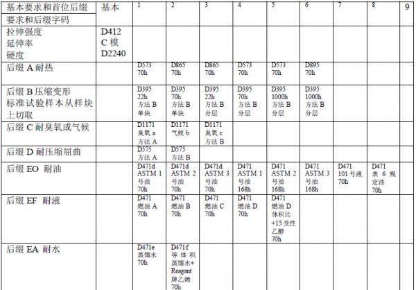 注6. 例如,用后缀字符和号码有A14和EO34, 后缀A(表3)说明耐热, 后缀1(表4)规定试验按D573方法,70h, 后缀4 (英文误写为A)表示试验温度为100℃.与此类似,EO34表示用ASTM 3号油按试验方法D471温度100℃,70h.